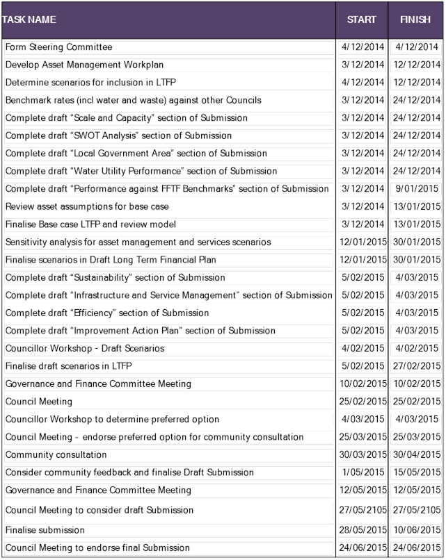 Table 1 below summarises the proposed timetable for completion of our FFTF ‘Improvement Proposal’ submission and includes a workshop with Council on the 4 February 2015.