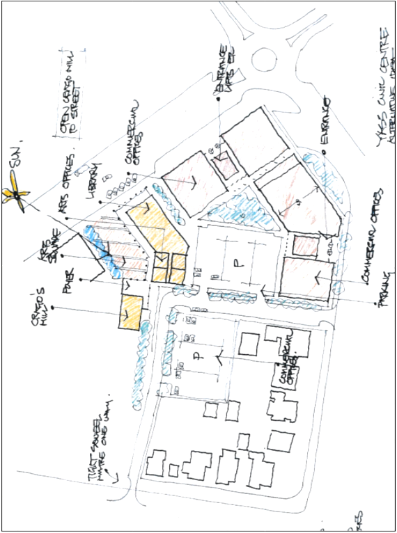 In April 2014 Council reconsidered the draft concept plan and expressed the view that a more general concept should be compiled that could provide development along Adele Street as well as Comur Street frontages. A broad concept for the site was drawn by Cox Architects in May 2014 (refer sketch below).