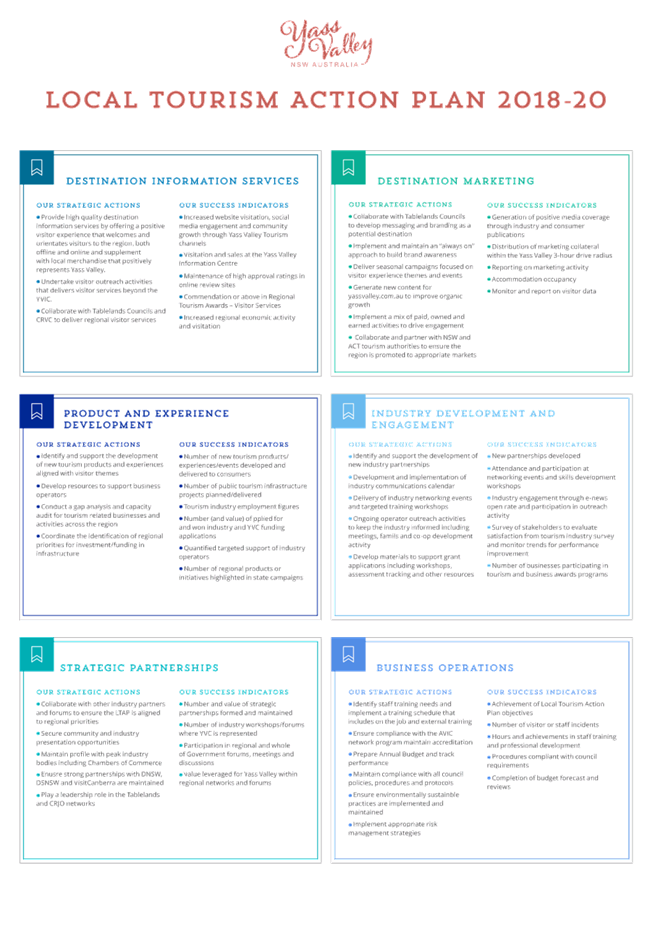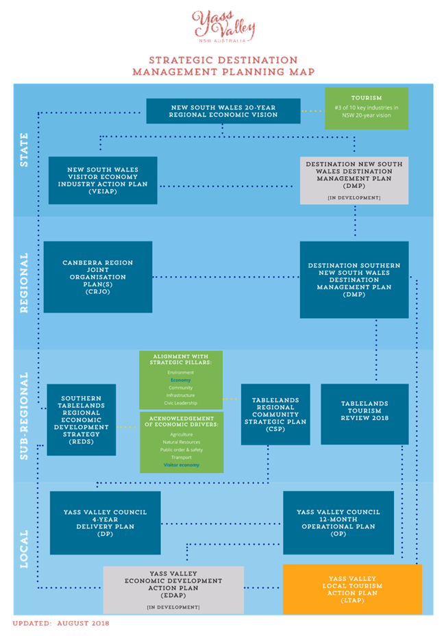 The development of the regional Destination Management Plan and implementation projects by Destination Southern NSW and the expiry of the Yass Valley Tourism Strategic Plan has led to the opportunity to identify and realign current and future activities of the EDT team with regional and State plans.