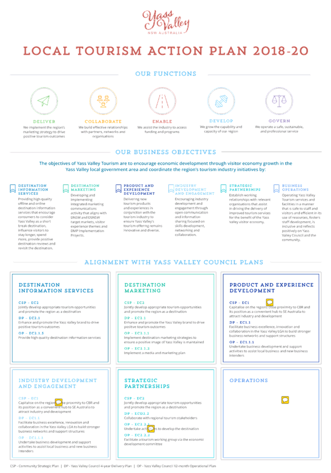 To provide some context of relevant plans the document at Attachment A is a map that identifies and aligns relevant strategic plans specifically for tourism but equally for broader delivery of economic development. We have commenced a DRAFT version at Attachment B that identifies the business objectives for our tourism service and alignment with Council plans; Regional Community Strategic Plan, Delivery Plan and Operational Plan. This document will be a high level plan that prioritises what Council will do and how success will be measured, in addition to acknowledging the key visitor experience themes and identification of our stakeholders. The development of an annual action plan aligned to this is underway.