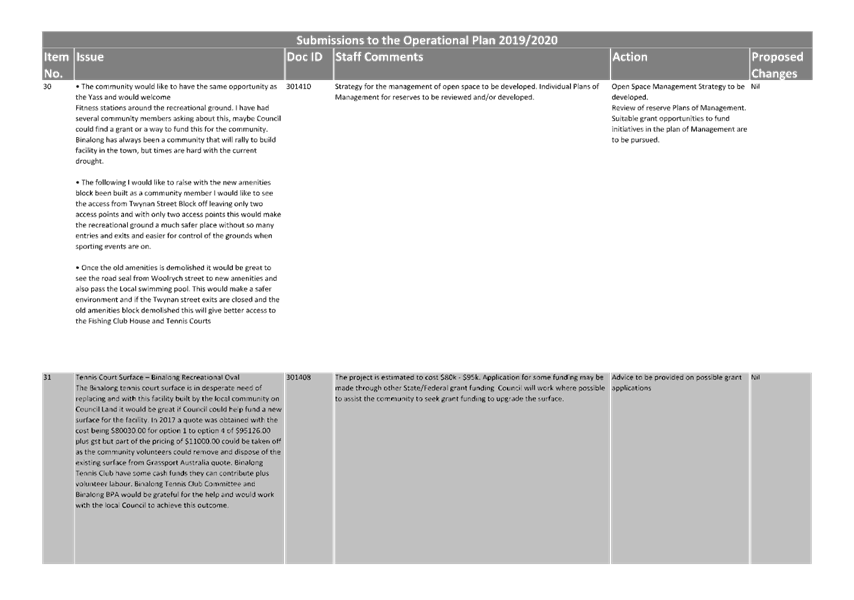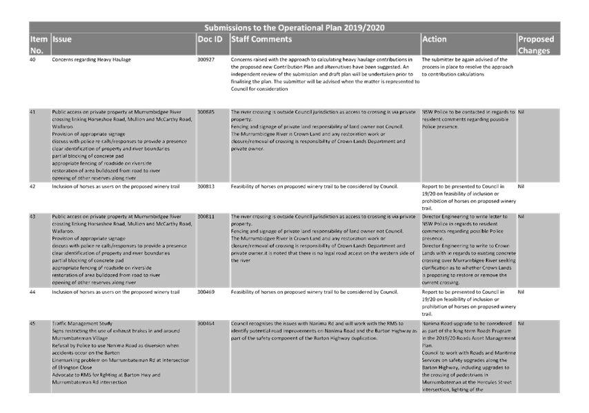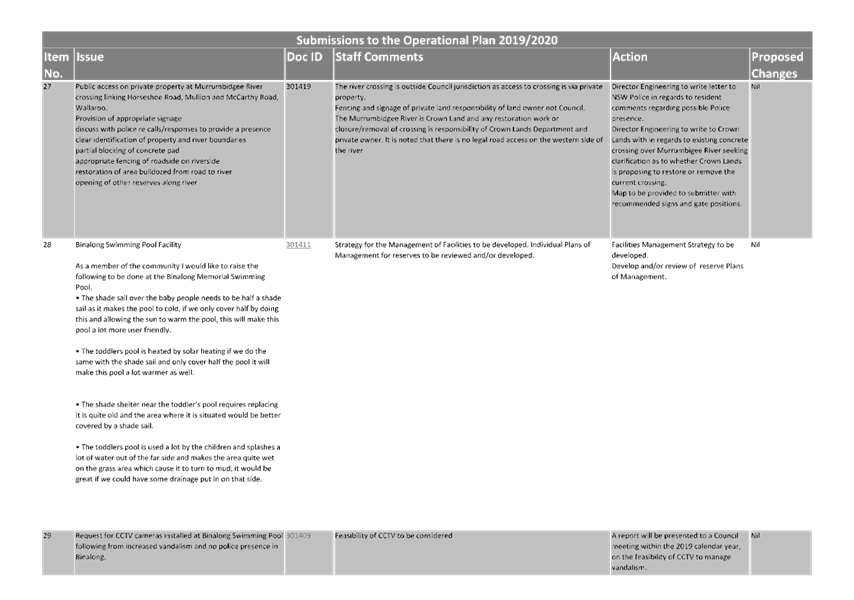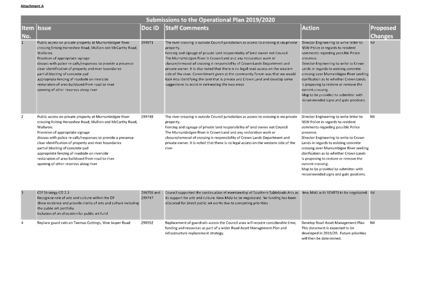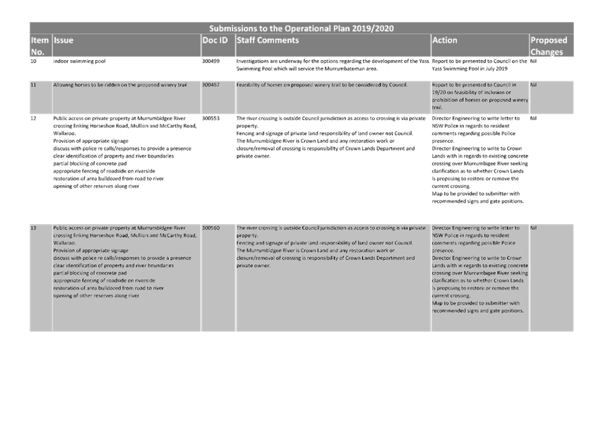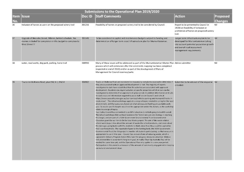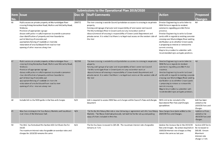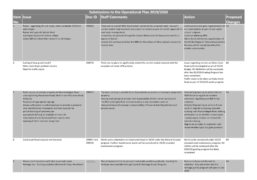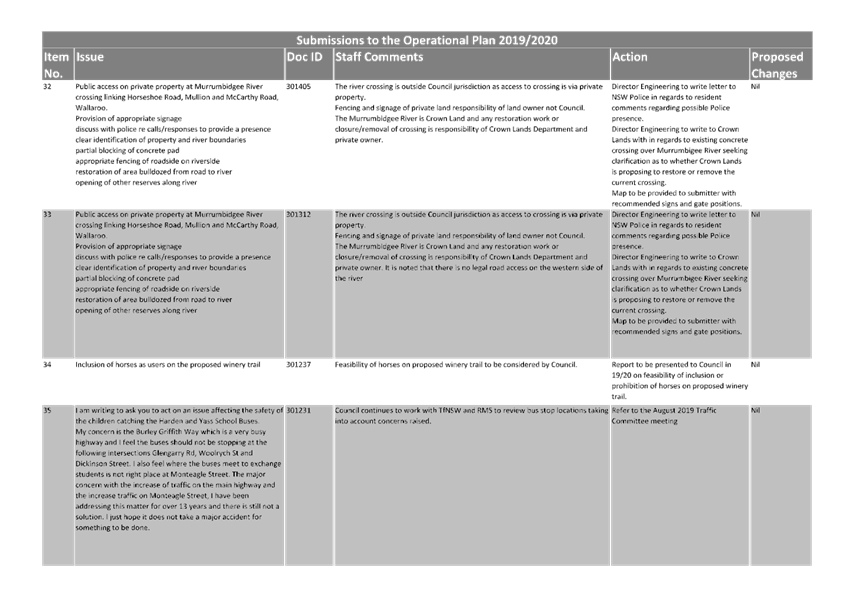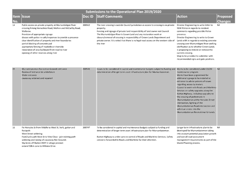 1. Investigate the potential to formalise and upgrade the car parking located in and adjacent to Joe O’Connor Park, Yass 2. Request Roads and Maritime Services to investigate: a. The creation of an additional exit to the carpark on Laidlaw Street, and b. Re-designing the Yass Public School carpark to separate the buses from the ‘parent’ parking. 3. Work with the Yass Primary School to trial to utilise all of the parallel parking in the Laidlaw Street car park for school teacher parking to prevent the need for parents/students to cross the carpark 4. Investigate the upgrade the intersection of Dutton Street and Rossi Street Yass to minimize the impact of the train lines 5. Install a ‘Give Way” sign in Monteagle Street at the intersection of Monteagle and Manning Streets Binalong 6. Install a “No-Through Road” sign on the street sign post for Guginya Place Yass